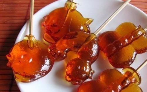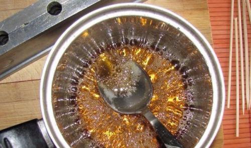 В кастрюльке мы смешаем сахар, лимонный сок и воду. Не нужно перемешивать очень тщательно, просто ставим на низкий огонь. Варим на низком огне, пока смесь не станет коричневой, ароматной и не будет застывать очень быстро. Теперь быстро заливаем смесь в формочки и вставляем палочки. Когда форма полностью застынет, можно доставать готовые леденцы.