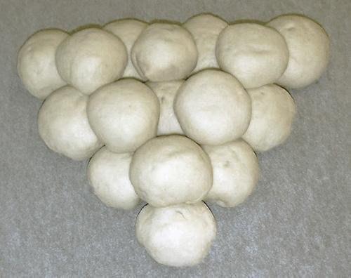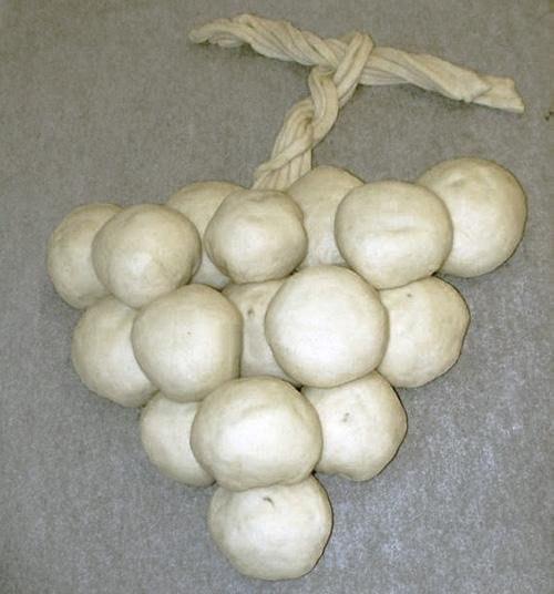 Тесто раскатать в пласт толщиной 8 мм, вырезать круги, выложить на них сухофрукты и орехи, посыпать сахаром, добавить небольшой кусочек сливочного масла. Хорошо защипать края, оформить пирожки в виде колобков и приступить в формовке пирога. Разделка "Виноградного Листочка". Для склеивания деталей мы смазываем разболтанным яичным желтком. Собираем пирог, даем расстояться минут 10-15, смазываем разболтанным яичным желтком и выпекаем при температуре 180 гр. С до готовности.