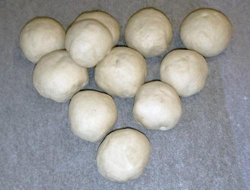 Замешать тесто. Тесто должно быть не густым и тяжелым (лучше потом перед разделкой припылить мукой. Тесто в процессе замеса быстро начинает облипать от рук. Положить в ёмкость и поместить в холодильник на 4 часа. Это тесто поднимается немного, но становится пышным и значительно увеличивается в объеме в процессе выпечки.