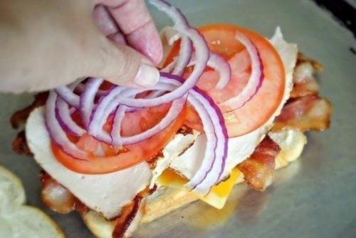 4. затем два ломтика помидоров, нарезанный лук, листья салата.