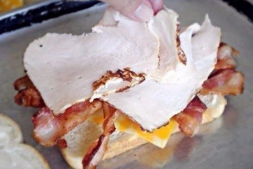 3. сверху кладём сыр и бекон, затем мясо.