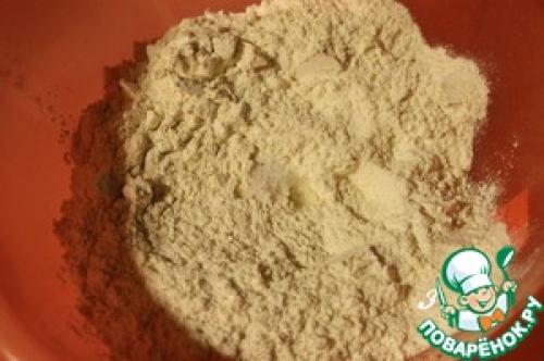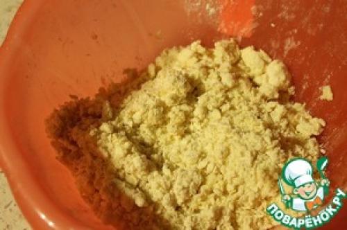 Приготовим сначала тесто №1. Для этого нужно порубить охлажденный маргарин вместе с мукой в мелкую крошку.