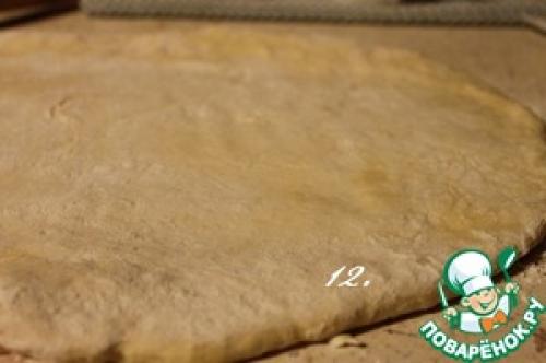 Через 30 минут достаем тесто из холодильника, кладем на раскатываемую поверхность таким же образом, как оно лежало на тарелке, и раскатываем скалкой, не сильно, так чтобы можно было вновь свернуть конвертом.