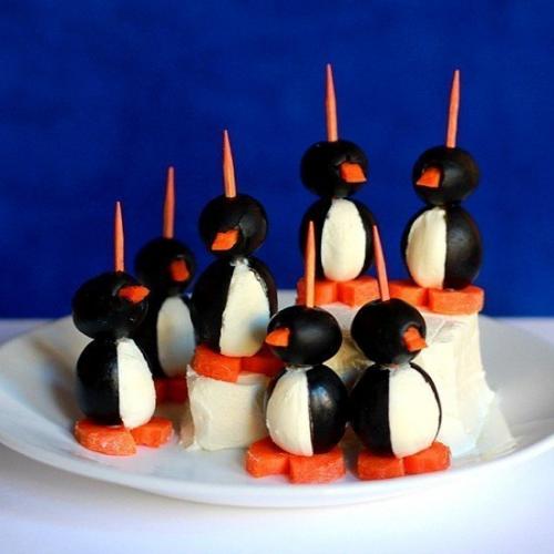 Для создания забавных "Пингвинчиков" понадобятся крупные и мелкие оливки без косточек, моцарелла, морковь. Из моркови нарезать тоненькие кружочки. Вырезать в морковных кружочках небольшие сектора - треугольнички. Треугольники будут клювами, а кружочки - лапками. Из моцареллы вырезать небольшие полосы, крупные оливки разрезать вдоль с одной стороны, вставить кусочки моцареллы. В маленькую оливку вставить кусочек моркови "Клювик". Собрать пингвинов: надеть на шпажку маленькую оливку с клювиком, большую оливку с кусочком моцареллы и последним - кружочек моркови - "Лапки". Поставить пингвинчиков на лапки. Канапе готовы!