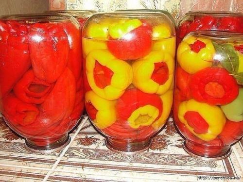 Из перца удалите семена, промойте, опустите на пару минут в кипящую воду и затем сразу же охладите в холодной воде. Банки простерилизуйте. Перец вложите один в другой или сплющите и укладывайте их вертикально в банки, вниз широкой частью. Приготовьте заливку, дайте ей закипеть. Уложенный перец залейте заливкой и поставьте стерилизовать: литровые банки на десять - пятнадцать минут, двухлитровые - на двадцать минут, трехлитровые - на двадцать пять минут. Потом сразу же закрывайте крышкой.