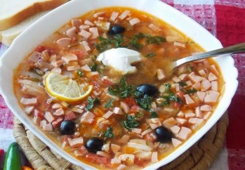 Достать ребра, дать им слегка остыть. Мясо отделить от костей и мелко нарезать. Так же мелко порезать сосиски или колбасу. В кипящий бульон из-под ребер добавить мясные продукты, тушеные овощи, томатную пасту, оливки, рассол, перец, лавровый лист и 1/2 лимона. Посолить по вкусу. Варить на медленном огне 15 минут. Перед подачей в каждую тарелку добавить рубленую зелень, ломтик лимона и сметану по вкусу.