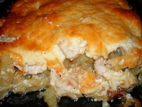 5. картофель почистить, порезать кружочками и выложить вторым слоем на курицу.