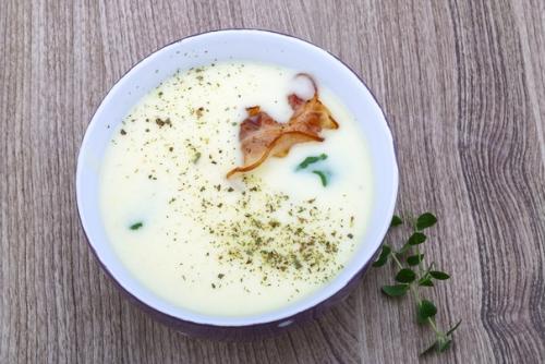 3. бульон доведите до кипения, добавьте сыр, нарезанный кубиками. Доведите до кипения, постоянно помешивая. Добавьте нарезанный готовый бекон и пережаренный лук.