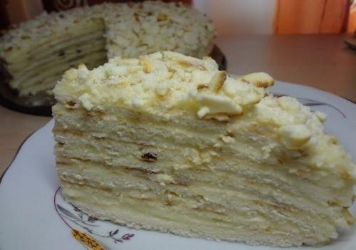 6. коржи смазываем теплым кремом, верх и бока посыпаем измельченными крошками.