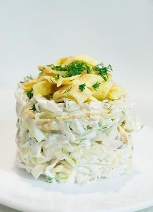 1. салат из белокочанной капусты с курицей и яичными блинчиками.