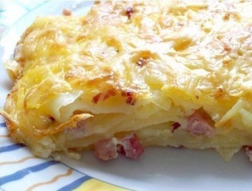 1. копчёный окорок нарезать кубиками, чеснок мелко порубить, картофель нарезать тонкими ломтиками (чем тоньше тем лучше.