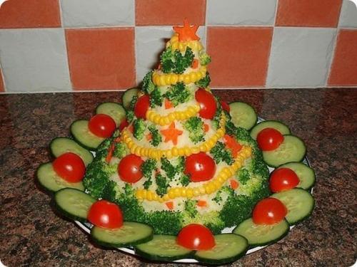 Потрите сыр на мелкой терке, добавьте в него чеснок и заправьте майонезом. Выложите салат на тарелку в форме елки, украсьте нарубленным укропом, кусочками моркови, кукурузой и болгарским перцем.