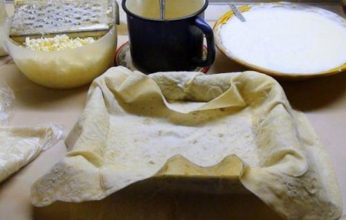 Форму для запекания смазываем растопленным сливочным маслом. Выкладываем в форму два листа лаваша (крест на крест.
