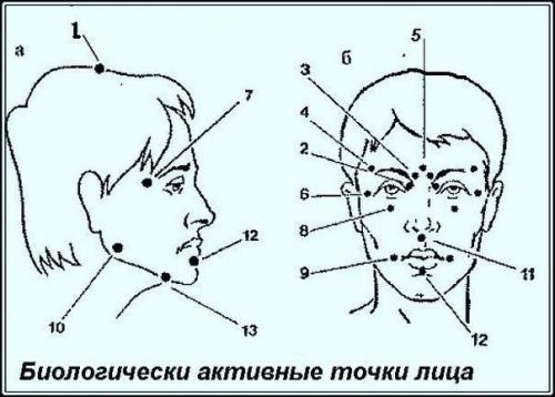 Аналогичные показания и у соседней точки 12, расположенной по средней линии в центре подбородочно - губной бороды.