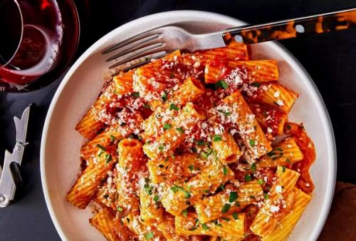 Аматричана ригатони. Традиционная итальянская паста с минимальным набором ингредиентов.