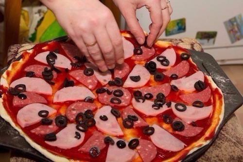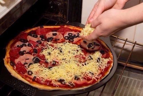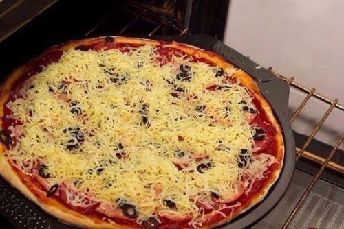 7. запекать примерно 10 минут в духовке при температуре 250 градусов. Сыр кладем когда пицца уже почти готова, чтобы он просто расплавился, а не запекся.