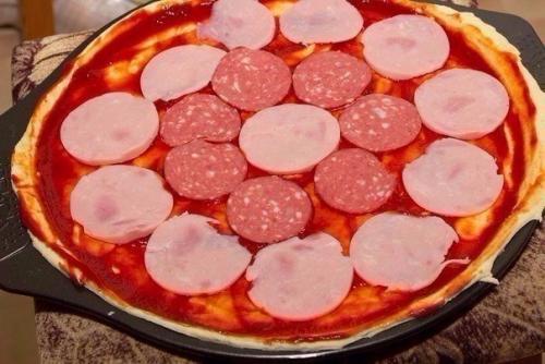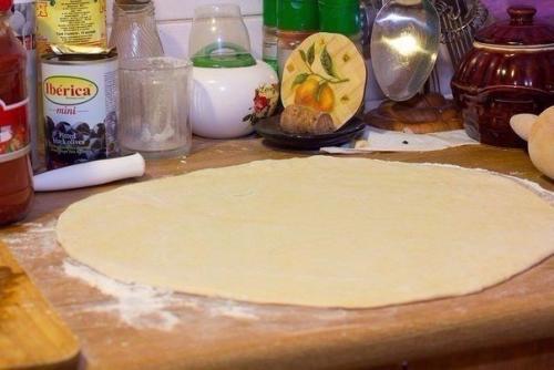 6. когда тесто подойдет разделяем на две части, раскатываем и кладем ингредиенты по вкусу.
