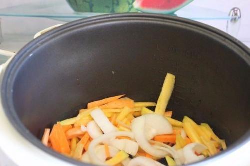 3. в мультиварке разогреть растительное масло, добавить лук и морковь, обжарить в течении 10 минут ( программа жарка).