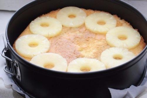 8. включить духовку на 150 C, поставить поддон с водой. Разъемную форму застелить пергаментом, вырезать полоски, застелить также бока. На дно формы кладем бисквит, сверху кольца ананасов. Суфле. Выпекать на 2-м уровне духовке 1 час 15 минут.