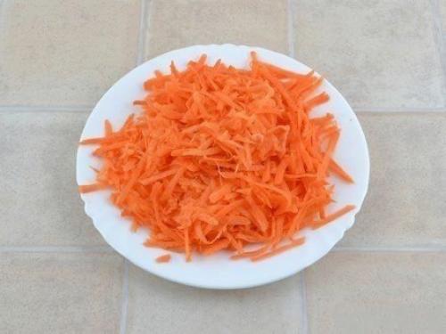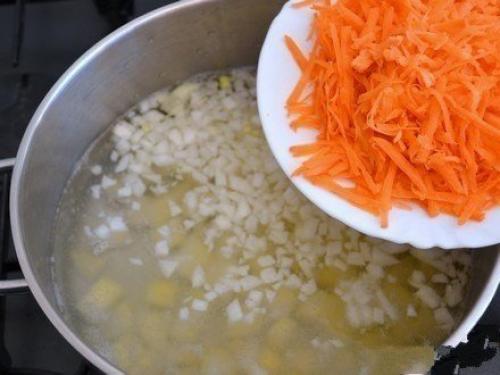 2. лук почистить, мелко порезать. Морковь почистить, натереть на крупной терке. Картофель почистить, порезать кубиками.