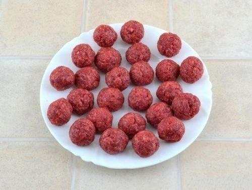1. фарш посолить, поперчить, добавить манку, хорошо вымесить. В руках небольшие плотные шарики сформировать.