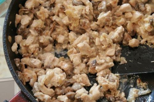 Мелко нарезаем курочку, грибы и лук, обжариваем их до готовности с использованием растительного масла, солим, перчим, добавляем сметану, мы доводим до кипения. Снимаем с огня.