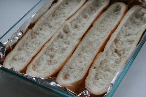 Багет разрезаем пополам вдоль, вынимаем из него мякиш.