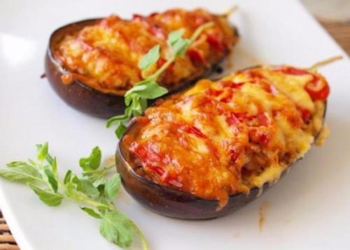 3. полученной смесь нафаршировать баклажаны, сверху разложить нарезанные помидоры, посыпать тертым сыром, сбрызнуть оливковым маслом. Поставить в разогретую до 180 градусов духовку на 30 минут. Приятного аппетита!