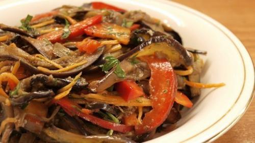 Баклажаны нарезать длинной соломкой, посолить и оставить на 30 минут. Затем откинуть баклажаны на дуршлаг и дать стечь соку. Обжарить баклажаны на растительном масле. Перец нарезать соломкой, лук нарезать полукольцами, морковь натереть на тёрке для корейской моркови. Чеснок почистить и пропустить через пресс. Соединить тёплые баклажаны, перец, лук, морковь, чеснок. Добавить сахар, соевый соус, уксус, кунжут. Всё хорошо перемешать и поставить в холодильник на пару часов. Приятного аппетита!