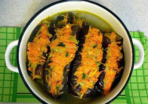 Теперь начините баклажаны овощами со сковороды. Хочу заметить что начинку не нужно солить, так как рассол достаточно соленый.