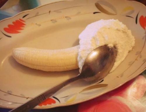 4. на банан ложкой стала выкладывать шубу. Банан в шубу одела.