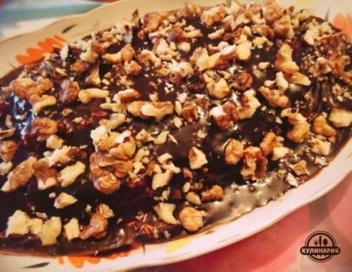6. покрасила шубу в шоколадный цвет. Аккуратно распределила глазурь по творожной массе. Украсила грецким орехом и отправила в холодильник на 2 часа. Приятного аппетита!