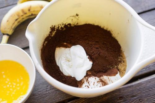 В чаше соедините муку (175 г), сахар (200 г), какао (60 г) и сметану (15%, 130 г. для такого десерта хочешь взять лучшее, поэтому я поделил сахар: 160 коричневого и 40 обычного. Вместо сметаны можно любой молочный продукт похожей жирности взять. Ещё сода (1 ч. л. ).