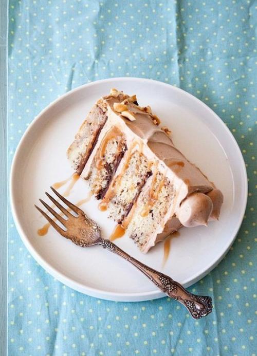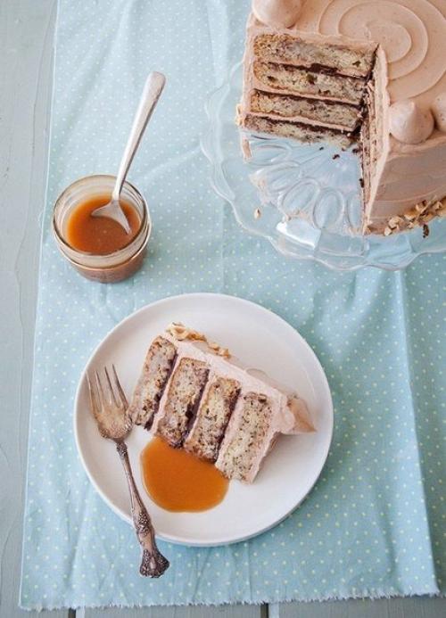 4. сборка: каждый бисквит разрезать на 2 коржа. Таким образом, мы получим 4 бисквита. Бисквит сначала покрыть тонким слоем ганаша, а затем поверх нанести крем. Сверху положить следующий бисквит и повторить действия. Так собрать весь торт. Верх и бока торта покрыть белково - масляным кремом и украсить дроблеными орехами (лесные, грецкие или пекан. Подавать можно с соленой карамелью - соусом. Приятного аппетита!