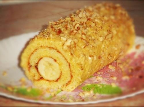 Горячий корж достаём из духовки и укладываем на подготовленное влажное полотенце. Смазываем корж кремом, оставив немного крема для конечной смазки. На один край коржа кладём банан и осторожно сворачиваем в рулетик.
