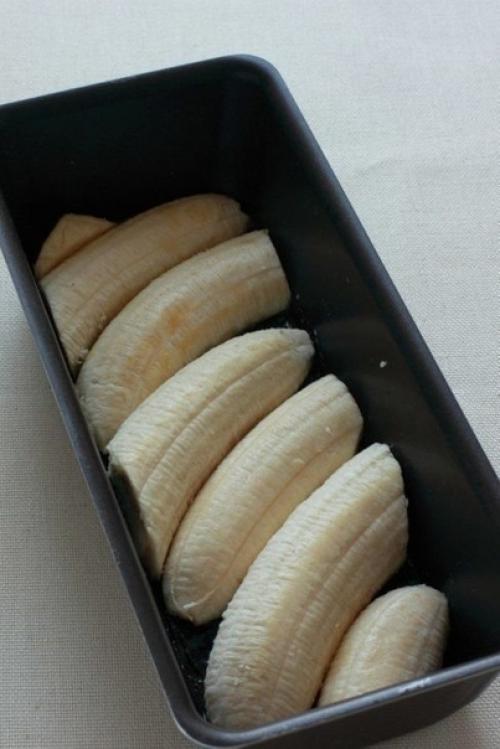 3. разрежьте бананы вдоль и выложите срезом на карамель.