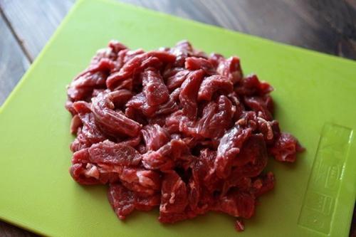 1 говядину мы нарезаем небольшими брусками.