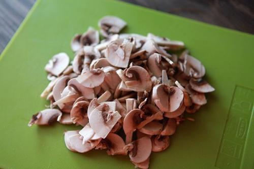 3 шампиньоны - тонкими пластинами. Грибы лучше протереть увлажненной салфеткой или обработать с помощью ножа. Но мыть без нужды не стоит - они быстро впитывают воду, которую потом придется долго выпаривать в сковороде.