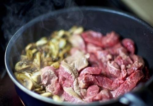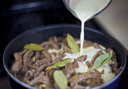 Пока готовятся грибы, нарежьте мясо тонкими полосками. Увеличьте огонь и положите мясо в сковороду. Жарьте, помешивая, пока каждый кусочек не обжарится. Добавьте в сковороду муку, лавровый лист и сливки.