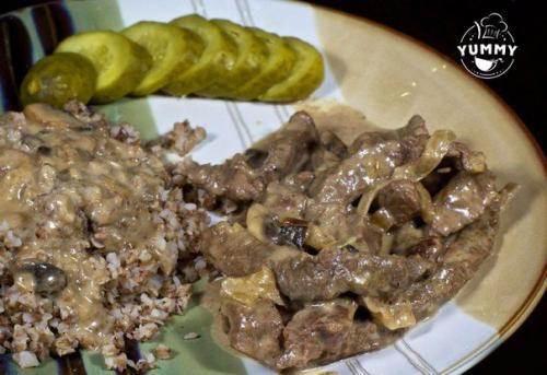 Посолите по вкусу, приправьте молотым черным перцем, накройте крышкой, уменьшите огонь до умеренного и тушите, пока мясо не станет мягким. Подавайте с рассыпчатой гречневой кашей. Приятного аппетита!