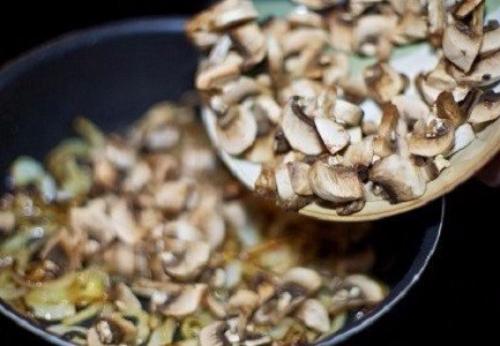 Разогрейте в высокой сковороде 2 столовые ложки растительного масла на среднем огне. Очистите лук, нарежьте его тонкими четвертинками колец и обжарьте до коричневого цвета, помешивая. Очистите и нарежьте ломтиками грибы, добавьте в сковороду, перемешайте и продолжайте жарить, пока не испарится сок.