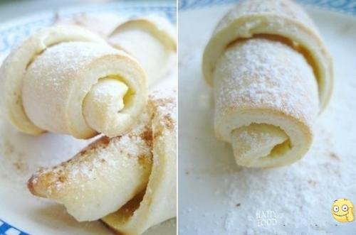 Присыпать треугольники сахаром и корицей. Завернуть рогалики.