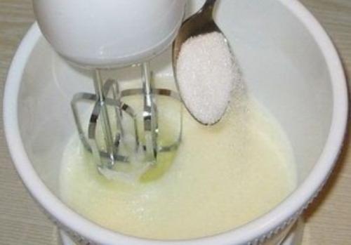2. когда белковая масса станет белой и довольно плотной, так же по ложке добавляем желтки, продолжая при этом взбивать.