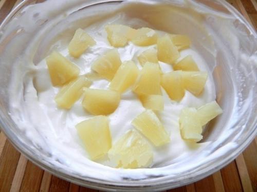 Осторожно влить желатин в творожную массу, тщательно перемешать. Добавить кусочки ананасов (ягоды) и снова перемешать.