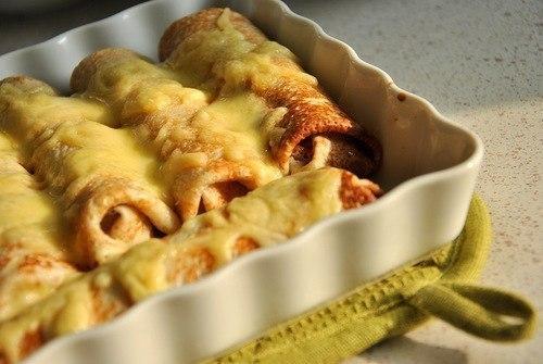 Формируем рулеты, заворачивая блин с начинкой трубочкой и подгибая бока, чтоб начинка не убежала. Складываем в форму для запекания, посыпаем натертым сыром и ставим в очень жаркую духовку минут на 10.