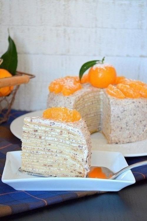 9. готовый торт необходимо выдержать в холодильнике минимум 5 часов. Я на ночь оставляла. Блинный торт при подаче можно шоколадом или ягодами украсить. Я украсила мандаринами - в преддверии праздника их яркость поднимает настроение! Приятного аппетита!