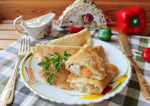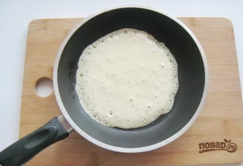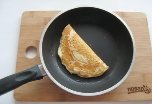 3. на раскаленную сковороду выливаем половником порцию теста. Ждем пока поверхность теста покроется пузырьками и слегка поджарится. Выкладываем две столовые ложки начинки на одну сторону блина. Накрываем другой половиной блина и прижимаем края, чтобы они "Склеились". Затем поджариваем блин с другой стороны.
