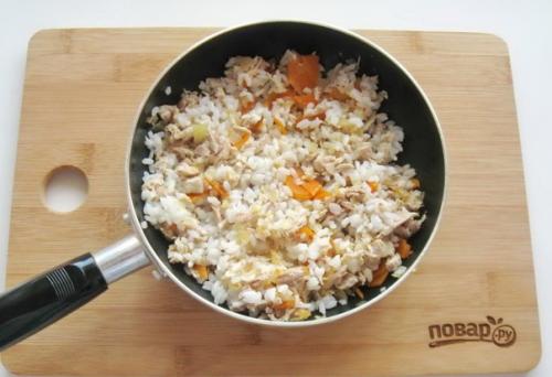 2. пока тесто подходит, приготовим начинку для блинов - пирожков. Морковь и лук очищаем, моем и нарезаем. Выкладываем в сковороду. Наливаем подсолнечное масло и тушим овощи 10-12 минут, периодически перемешивая. Любое отварное мясо мелко нарезаем и добавляем в сковороду к луку и моркови. Также добавляем отварной рис. Начинку солим по вкусу и перемешиваем. Можно и поперчить.