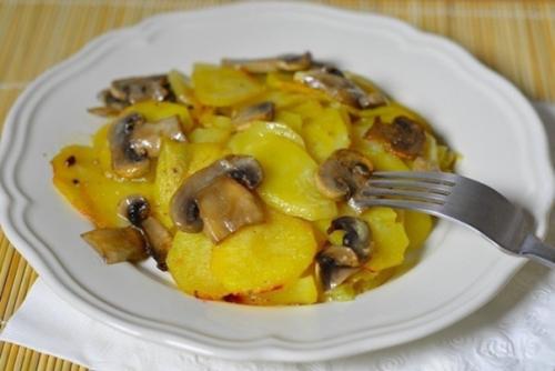 5. разогрейте масло в сковороде с толстым дном на среднем огне. Выложите ломтики картофеля, перемешайте деревянной ложкой так, чтобы все ломтики были покрыты маслом. Добавьте соль, перец. Продолжайте перемешивать до тех пор, пока не увидите, как ломтики картофеля становятся клейкими, т. к. картофель начинает выделять крахмал.