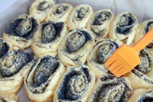 Красиво выкладываем на противень, застеленный пергаментной бумагой, смазываем взбитым яйцом наши булочки с маком, чтобы они выглядели наряднее, когда испекутся.